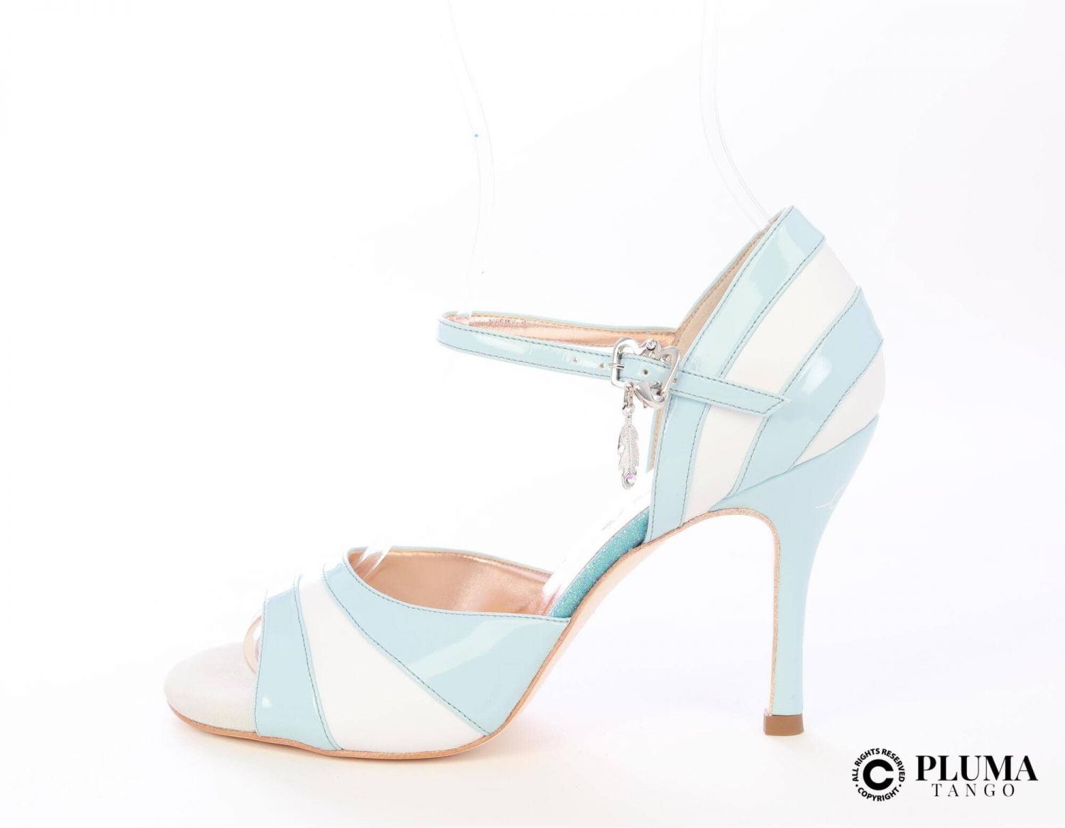 Modello Anemore in vernice bianco & celeste tacco 90 . Da nuova la suola è protetta da una pellicola adesiva trasparente, da togliere prima dell'utilizzo. Realizzata con i migliori materiali italiani. La scarpa ha un eccezionale "balance". Il sottopiede di ogni Pluma è imbottito con "memoryfoam". Design elegante. La scarpa sarà venduta completa di borsa di raso stampata con due scomparti separati per non rovinare le scarpe, ottimo storage.