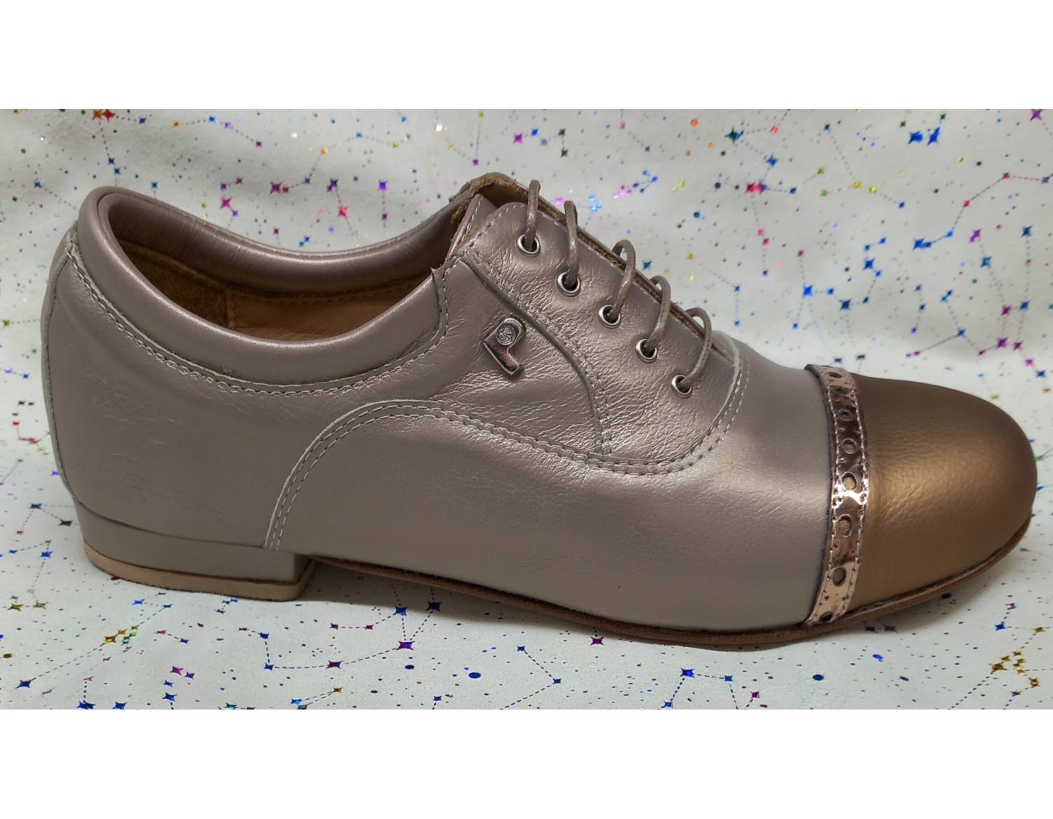 Katy  in pelle morbidissima col. 851  e punta in laminato platino. Suola gaucho spezzata  per esterno adatta per arrivare in Milonga o da utilizzare per le pratiche per gli allenamenti e per tutte le ragazze che desiderano ballare da leader! La scarpa sarà venduta completa di borsa di raso stampata con due scomparti separati per non rovinare le scarpe,...