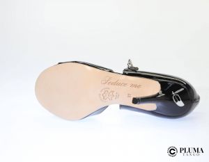 Una bella scarpa realizzata in pelle morbidissima vernice nero  Il modelloLos Angeles /   presenta una allacciatura twins con tacco 90 y . Suola in cuoio spazzolato e ammorbidito, molto flessibile, resistente e con un buon supporto. Da nuova la suola è protetta da una pellicola adesiva trasparente, da togliere prima dell'utilizzo. Realizzata con i migliori materiali italiani. Il modello è molto avvolgente e sensuale. La scarpa ha un eccezionale "balance". Il sottopiede di ogni Pluma è imbottito con "memoryfoam". Design elegante. La scarpa sarà venduta completa di borsa di raso stampata con due scomparti separati per non rovinare le scarpe, ottimo storage .